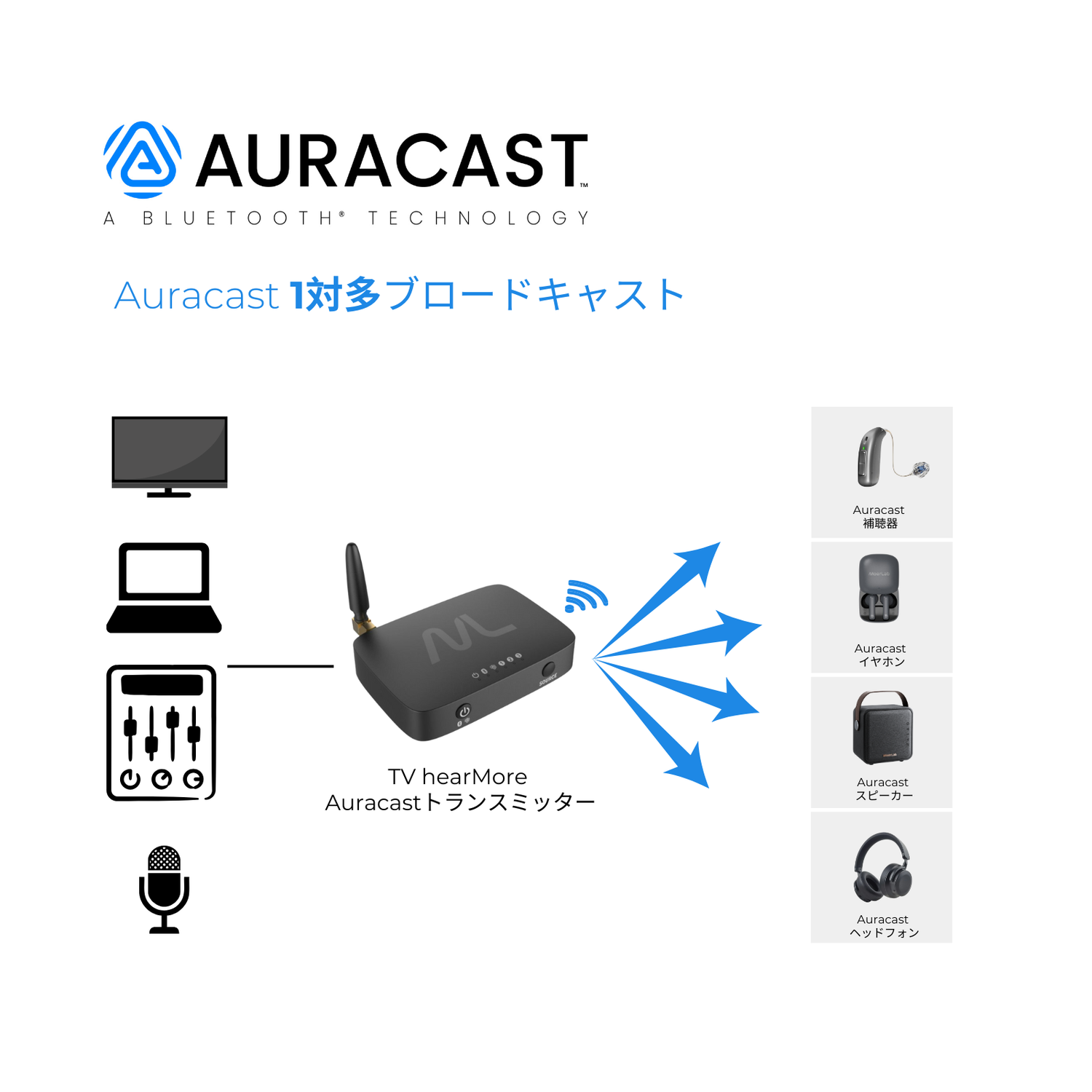 Auracast™ は、1 つの送信機から無制限の互換性のある受信機にオーディオをブロードキャストできる次世代 Bluetooth® LE オーディオ テクノロジーです。